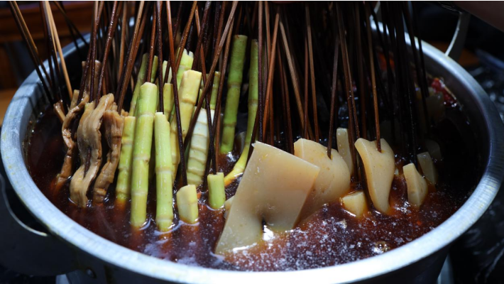 同样热闹的,还有城边上的天宫庙麻辣烫——入味十足的老魔芋,脆嫩爽口的鲜笋子,再蘸上秘制蘸料,粗粝的质感裹着活色生香的辣意,一口下去,仿佛瞬间穿回二十年前,那个推着小车、一角钱一串就能心满意足的简单年代。“我们不搞花架子,就像在自家院里吃东西,靠的就是这份实在,才留得住人。”老板一边忙活一边说,语气里满是马边人特有的质朴。