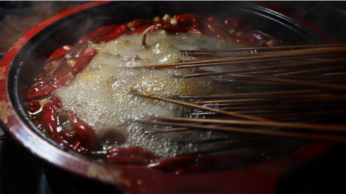 马边的大街小巷,遍布着大大小小的麻辣烫店。虽说每家店都有自己的独门配方,但那锅“上红下白”的汤料,却是马边麻辣烫共同的味儿。