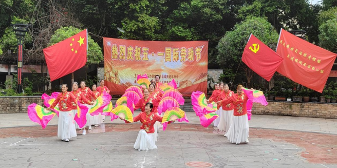 县老体协民建镇光明社区活动小组在光明大道喷水广场开展庆祝“五一”劳动节活动。队员们穿着节日的盛装,用歌舞的形式庆祝“五一”节。先后表演了《没有共产党就沒有新中国》《开门红》《手心有你》《母亲》等节目。